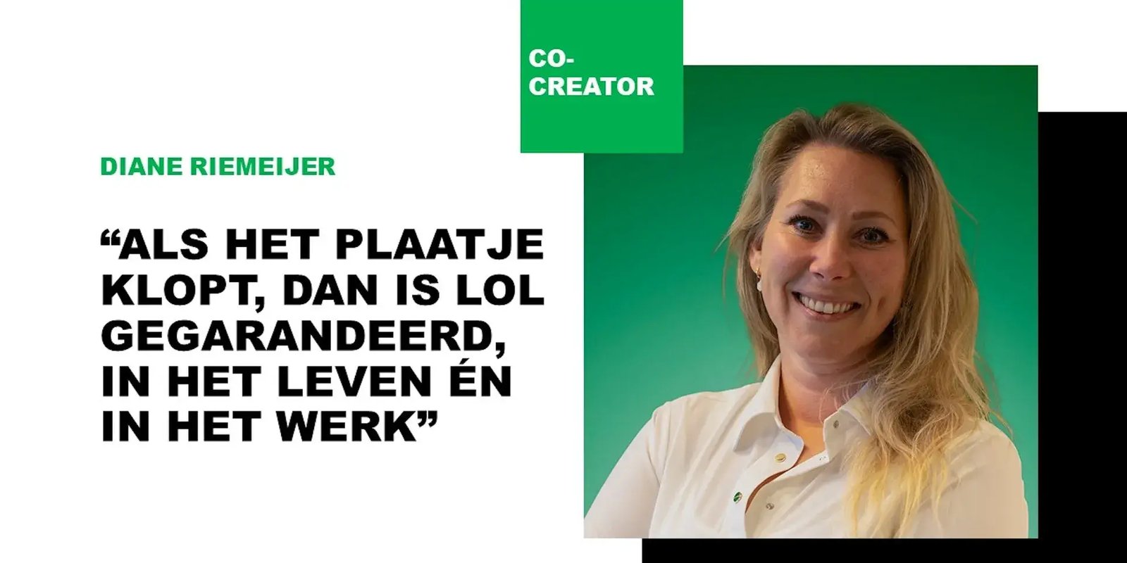 Als jonge vrouw zag Diane zichzelf op de kunstacademie. Of als psychologe. “Sommige dingen zijn geweest”, zegt ze daar nu over. “Ik teken en schilder tegenwoordig minder. De creativiteit die ik daarin kwijt kon, kan ik nu kwijt in het creatief denken. Sparren met collega’s is voor mij een belangrijk onderdeel van mijn werk. Ik vind het heerlijk om mijn eigen brein te verrijken met andere invalshoeken en zo-kan-het-ooks. Continu denk ik erover na hoe we zaken als team zo slim mogelijk kunnen aanpakken. Zo zocht ik naar een slimme manier om uitkomsten van brainstormsessies met de klant te analyseren. Een collega kwam met een AI-oplossing waar ik nooit aan had gedacht. Dat is voor mij pure co-creatie: samen waarde toevoegen voor de klant. En ik vind het leuk om het leuk te hebben met elkaar. Om écht te kunnen lachen samen, moet je elkaar goed leren kennen.”