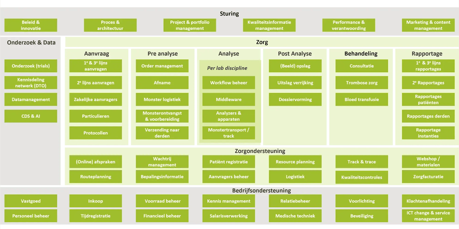 Het LiRA combineert de kracht van bestaande referentiearchitecturen met de specifieke behoeften van medische laboratoria. Voor de generieke onderdelen, zoals bedrijfsvoering, HRM en financiën, hebben we onderdelen van de ZiRA overgenomen. Dit zorgt voor een gemeenschappelijke taal tussen zorginstellingen en voor voormalige ziekenhuislaboratoria zijn dit soms functies die nog door het ziekenhuis ondersteunt worden. Voor de kernprocessen van laboratoria —aanvraag, preanalyse, analyse, post analyse en rapportage — hebben wij gekozen voor een laboratoriumspecifieke invulling. Dit is essentieel, want laboratoria verschillen hierin sterk van andere zorgorganisaties. Een ziekenhuisafdeling heeft patiëntenzorg als hoofddoel, terwijl een laboratorium draait om snelle, betrouwbare en reproduceerbare analyses van monsters. Zie bijvoorbeeld de COVID-19 PCR-test, waarbij snelheid en schaalbaarheid cruciaal zijn. Of specialistische genetische onderzoeken, waar nauwkeurigheid en traceerbaarheid centraal staan. Zulke specifieke eisen vragen om een eigen architectuurdomein.